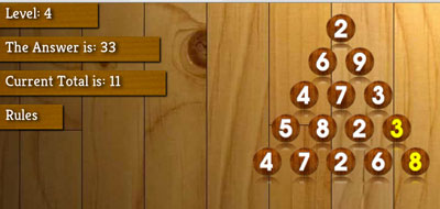 Bij Triangle moet je het doelgetal maken door de juiste bollen aan te klikken. Er is een tijdslimiet.