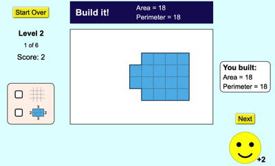 Spel met enkele niveaus, waarin het eerst alleen gaat om oppervlakte, maar daarna moet je zowel rekening houden met oppervlakte als omtrek.