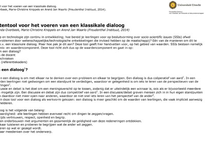 ![]() Samenvatting Wetenschap en technologie zijn continu in ontwikkeling; hoe bereid je leerlingen voor op besluitvorming over socio-scientific issues (SSIs) ofwel complexe problemen door wetenschappelijke/technologische ontwikkelingen die invloed hebben op de maatschappij? E?n van de manieren om dit te doen is d.m.v. een klassikale dialoog. Maar hoe pak je dit aan? Deze tool geeft hier handvatten voor, op het gebied van waarden. SSIs bestaan namelijk uit een kennis- en waardencomponent. Deze tool richt zich dus op de waardencomponent en gaat in op: - Waarom een dialoog? - Rol van de docent - Vraagtechnieken - Frames (referentiekaders) |
